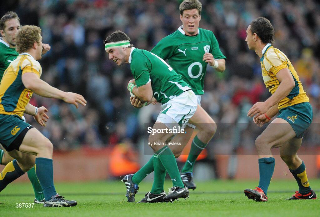 15 November 2009; Paddy Wallace, Ireland, supported by team-mate Ronan O'Gara, in action against Australia. Autumn International Guinness Series 2009, Ireland v Australia, Croke Park, Dublin. Picture credit: Brian Lawless / SPORTSFILE