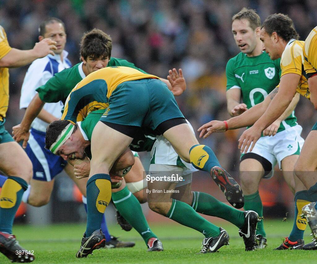 15 November 2009; Paddy Wallace, Ireland, supported by team-mates Donncha O'Callaghan and Paddy Wallace, in action against Australia. Autumn International Guinness Series 2009, Ireland v Australia, Croke Park, Dublin. Picture credit: Brian Lawless / SPORTSFILE