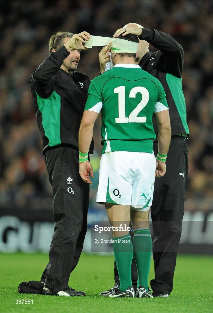 15 November 2009; Ireland's Paddy Wallace has his head bandaged by team physio Cameron Steele. Autumn International Guinness Series 2009, Ireland v Australia, Croke Park, Dublin. Picture credit: Brendan Moran / SPORTSFILE