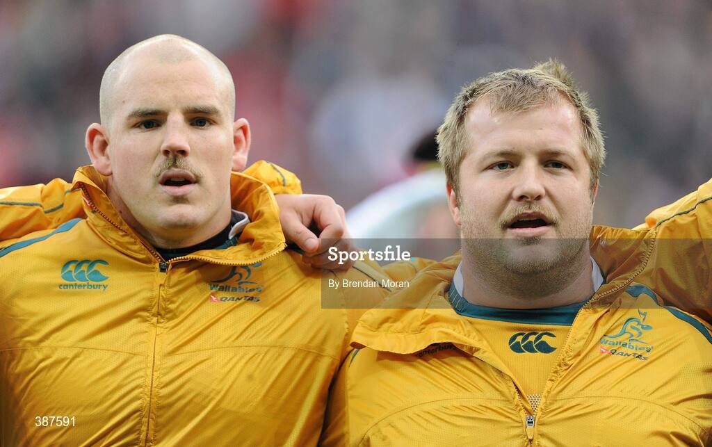 15 November 2009; Australian front rowers Stephen Moore, left, and Benn Robinson during the national anthems before the game. Autumn International Guinness Series 2009, Ireland v Australia, Croke Park, Dublin. Picture credit: Brendan Moran / SPORTSFILE