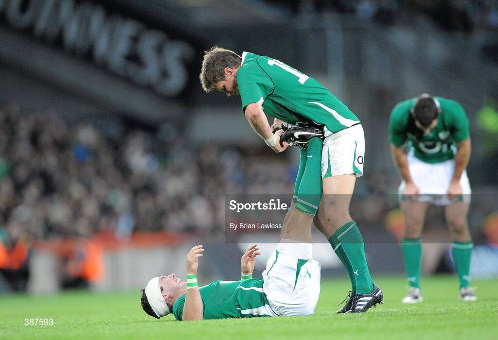 15 November 2009; Ireland's Ronan O'Gara assists team-mate Paddy Wallace. Autumn International Guinness Series 2009, Ireland v Australia, Croke Park, Dublin. Picture credit: Brian Lawless / SPORTSFILE