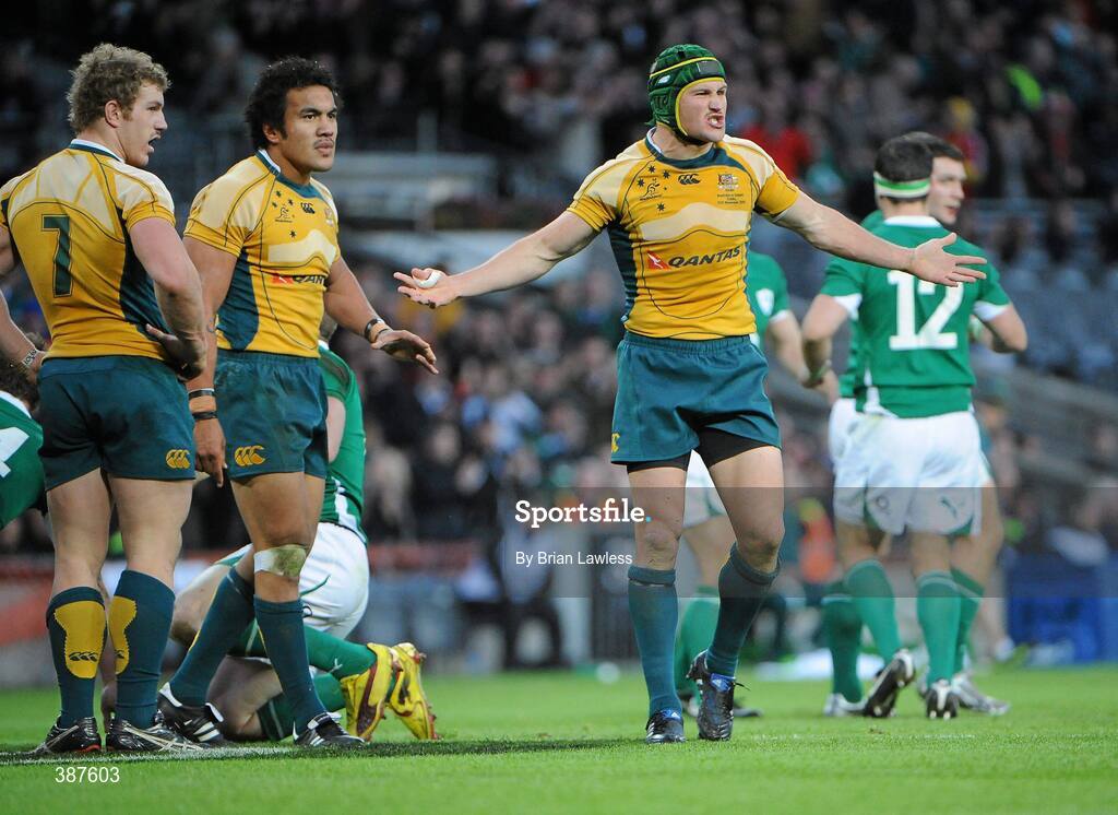 15 November 2009; Matt Giteau, right, Digby Ioane, and David Pocock, Australia, react after conceding their first try to Tommy Bowe, Ireland. Autumn International Guinness Series 2009, Ireland v Australia, Croke Park, Dublin. Picture credit: Brian Lawless / SPORTSFILE