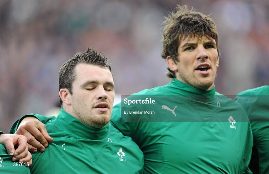 15 November 2009; Prop Cian Healy, left, sings the national anthem, alongside Donncha O'Callaghan, on his first start for Ireland. Autumn International Guinness Series 2009, Ireland v Australia, Croke Park, Dublin. Picture credit: Brendan Moran / SPORTSFILE