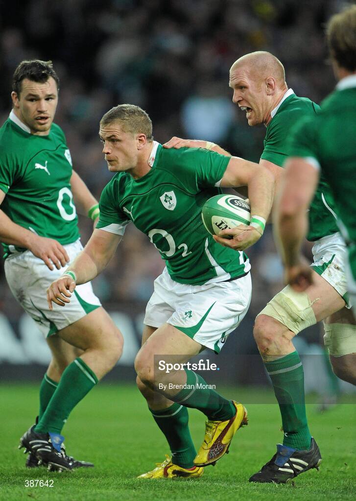 15 November 2009; Jamie Heaslip, Ireland, supported by team-mates Cian Healy, left, and Paul O'Connell. Autumn International Guinness Series 2009, Ireland v Australia, Croke Park, Dublin. Picture credit: Brendan Moran / SPORTSFILE