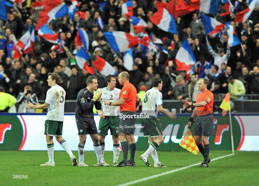 18 November 2009; Republic of Ireland players, from left, Kevin Kilbane, Shay Given, Sean St. Ledger and Keith Andrews remonstrate with officals after William Gallas scored his side's goal. FIFA 2010 World Cup Qualifying Play-off 2nd Leg, Republic of Ireland v France, Stade de France, Saint-Denis, Paris. Picture credit: David Maher / SPORTSFILE