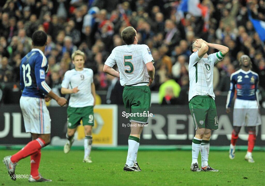 18 November 2009; Dejected Republic of Ireland players Kevin Doyle, Richard Dunne and Robbie Keane at the final whistle. FIFA 2010 World Cup Qualifying Play-off 2nd Leg, Republic of Ireland v France, Stade de France, Saint-Denis, Paris. Picture credit: David Maher / SPORTSFILE