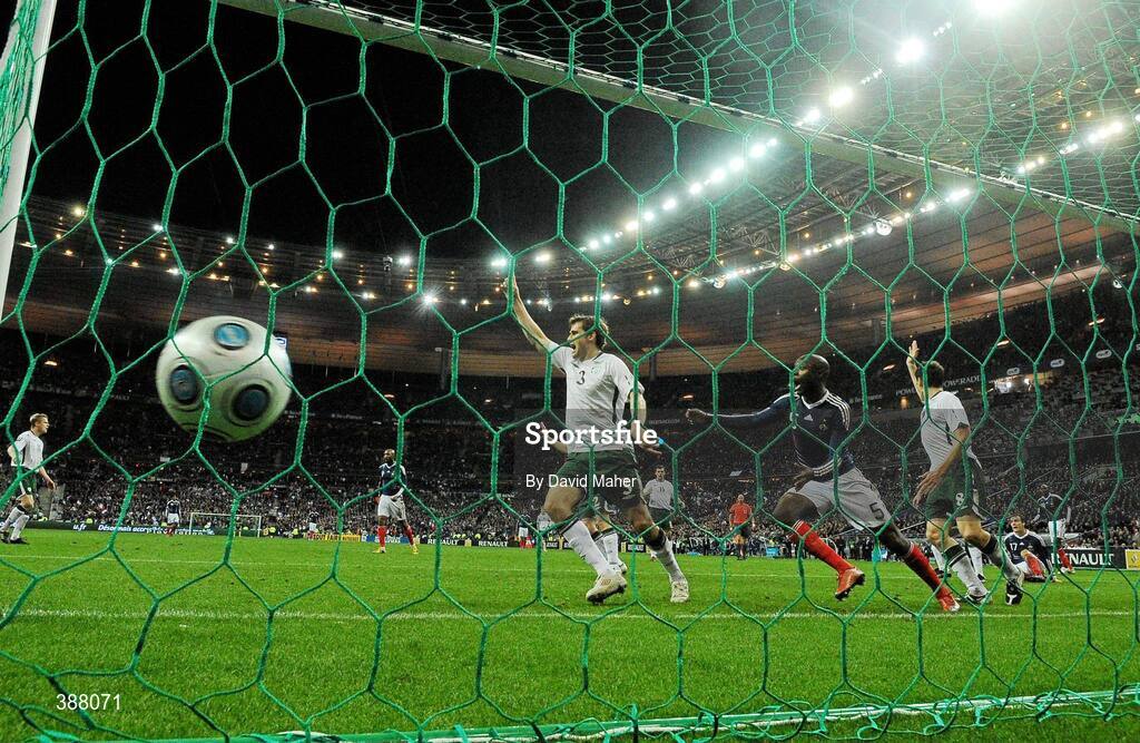 18 November 2009; William Gallas, France, 5, scores his side's first goal after Thierry Henry had handled the ball as Republic of Ireland players appeal. FIFA 2010 World Cup Qualifying Play-off 2nd Leg, Republic of Ireland v France, Stade de France, Saint-Denis, Paris, France. Picture credit: David Maher / SPORTSFILE