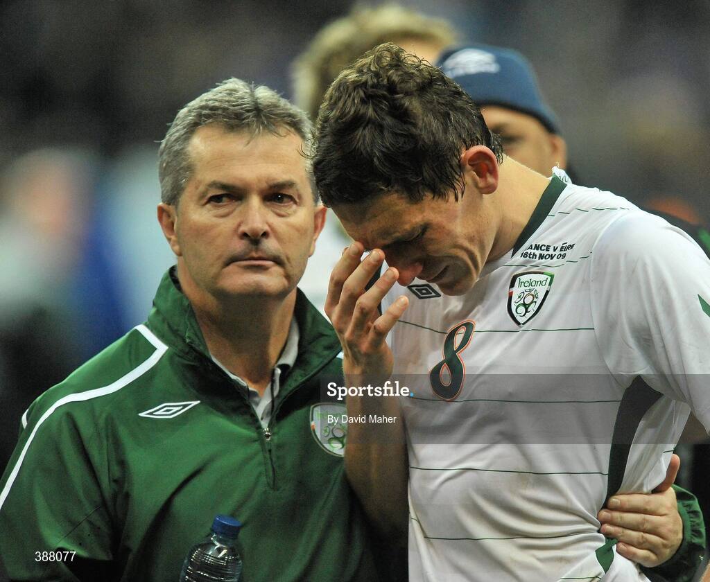 18 November 2009; The Republic of Ireland team doctor, Dr Alan Byrne, with a dejected Keith Andrews after the game. FIFA 2010 World Cup Qualifying Play-off 2nd Leg, Republic of Ireland v France, Stade de France, Saint-Denis, Paris, France. Picture credit: David Maher / SPORTSFILE