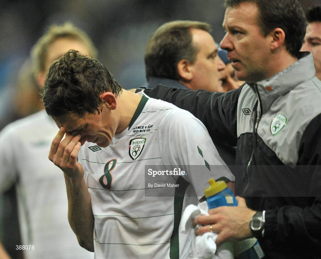18 November 2009; The Republic of Ireland goalkeeping coach, Alan Kelly, with a dejected Keith Andrews after the game. FIFA 2010 World Cup Qualifying Play-off 2nd Leg, Republic of Ireland v France, Stade de France, Saint-Denis, Paris, France. Picture credit: David Maher / SPORTSFILE