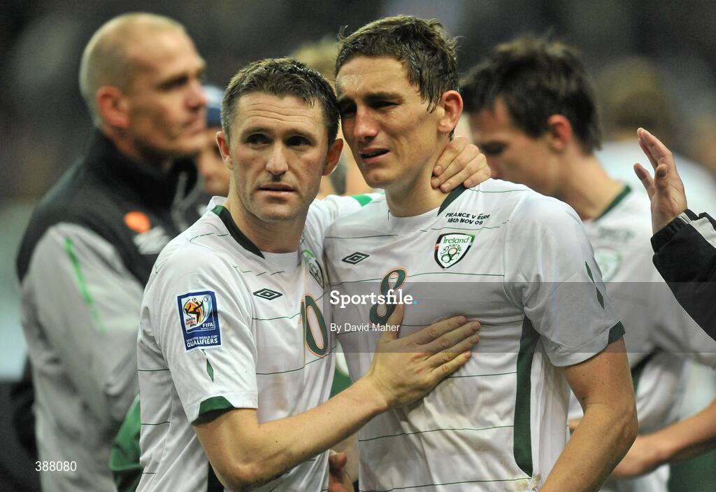 18 November 2009; Republic of Ireland players Robbie Keane and Keith Andrews comfort each other after the final whistle FIFA 2010 World Cup Qualifying Play-off 2nd Leg, Republic of Ireland v France, Stade de France, Saint Denis, Paris. Picture credit: David Maher / SPORTSFILE
