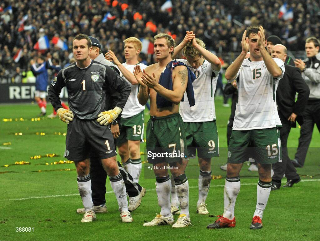 18 November 2009; Dejected Republic of Ireland players, left to right, Shay Given, Paul McShane, Liam Lawrence, Kevin Doyle and Darron Gibson salute the crowd at the end of the game. FIFA 2010 World Cup Qualifying Play-off 2nd Leg, Republic of Ireland v France, Stade de France, Saint-Denis, Paris, France. Picture credit: David Maher / SPORTSFILE
