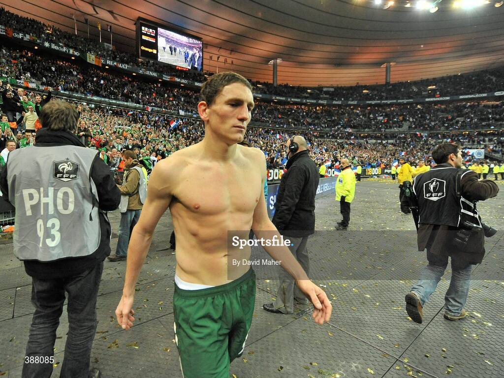 18 November 2009; Republic of Ireland player Keith Andrews walks back to the pitch, after throwing his jersey to the supporters, at the end of the game. FIFA 2010 World Cup Qualifying Play-off 2nd Leg, Republic of Ireland v France, Stade de France, Saint-Denis, Paris, France. Picture credit: David Maher / SPORTSFILE
