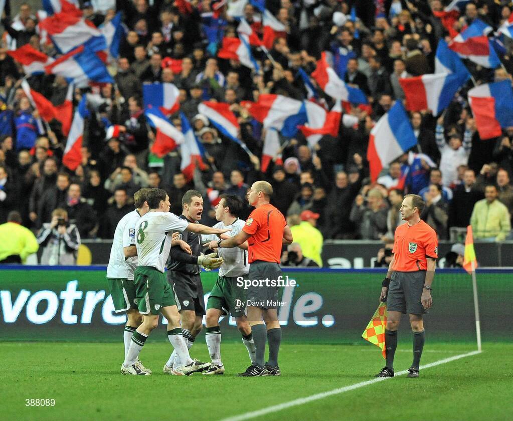 18 November 2009; Republic of Ireland players Keith Andrew, Shay Given and Sean St. Ledger remonstrate with referee Martin Hansson after William Gallas, France, scored his side's goal. FIFA 2010 World Cup Qualifying Play-off 2nd Leg, Republic of Ireland v France, Stade de France, Saint-Denis, Paris. Picture credit: David Maher / SPORTSFILE