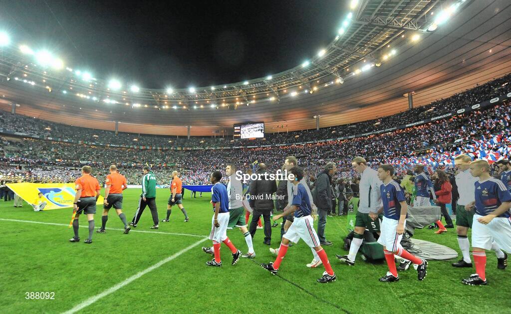 18 November 2009; Players from the Republic of Ireland and France teams walk out for the start of the game. FIFA 2010 World Cup Qualifying Play-off 2nd Leg, Republic of Ireland v France, Stade de France, Saint-Denis, Paris, France. Picture credit: David Maher / SPORTSFILE