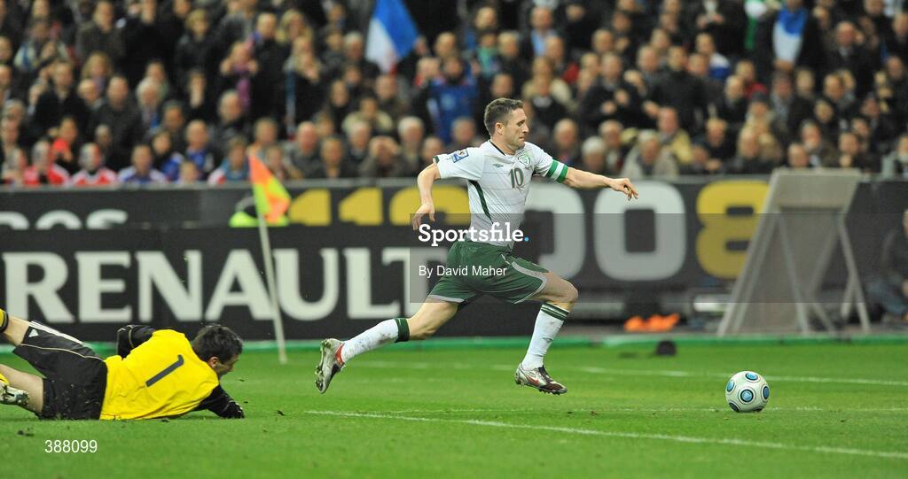 18 November 2009; Robbie Keane, Republic of Ireland, beats France goalkeeper Hugo Lloris only to see the ball run over the end line. FIFA 2010 World Cup Qualifying Play-off 2nd Leg, Republic of Ireland v France, Stade de France, Saint-Denis, Paris, France. Picture credit: David Maher / SPORTSFILE