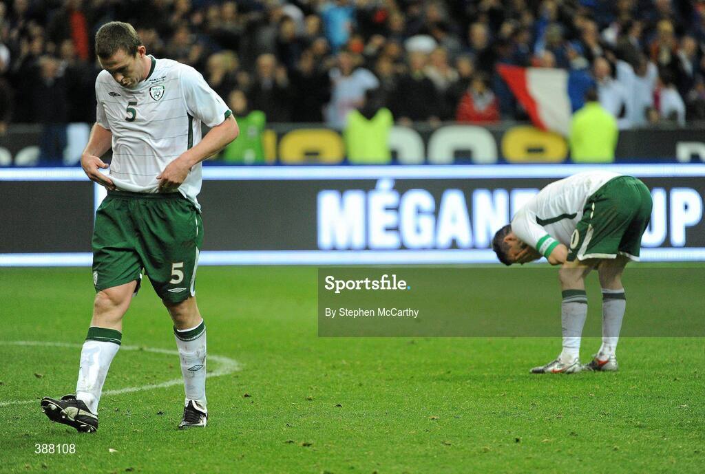 18 November 2009; Dejected Republic of Ireland players Richard Dunne, left, and Robbie Keane after the final whistle. FIFA 2010 World Cup Qualifying Play-off 2nd Leg, Republic of Ireland v France, Stade de France, Saint-Denis, Paris, France. Picture credit: Stephen McCarthy / SPORTSFILE