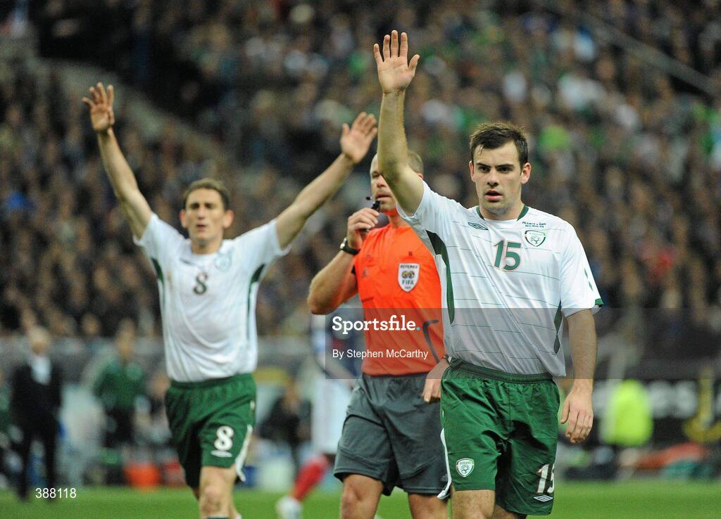 18 November 2009; Republic of Ireland players Darron Gibson, right, and Keith Andrews. FIFA 2010 World Cup Qualifying Play-off 2nd Leg, Republic of Ireland v France, Stade de France, Saint-Denis, Paris, France. Picture credit: Stephen McCarthy / SPORTSFILE