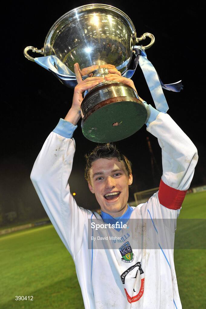 2 December 2009; UCD captain Michael Leahy celebrates with the cup. Under-20 Dr. Tony O’Neill League of Ireland Cup Final, UCD v Salthill Devon, UCD Bowl, Belfield, Dublin. Picture credit: David Maher / SPORTSFILE