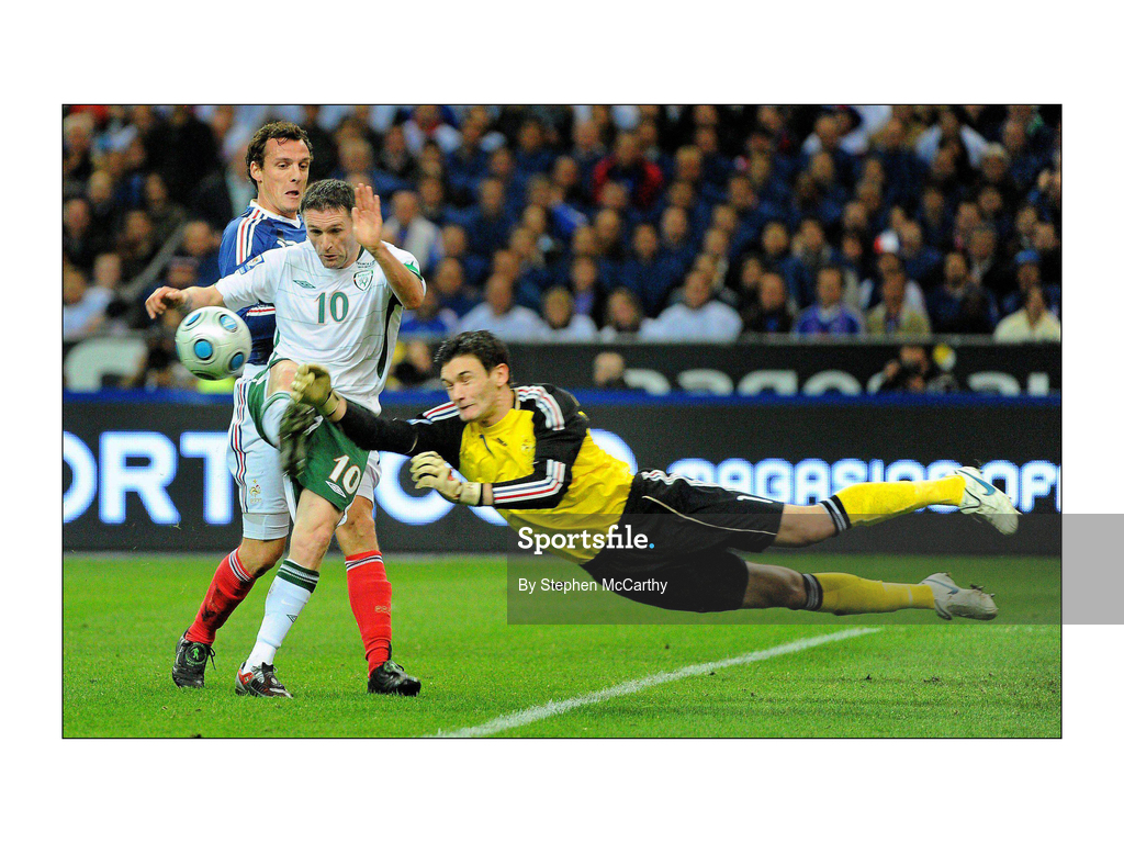 18 November 2009; France goalkeeper Hugo Lloris saves at the feet of Republic of Ireland's Robbie Keane. FIFA 2010 World Cup Qualifying Play-off 2nd Leg, Republic of Ireland v France, Stade de France, Saint-Denis, Paris, France. Picture credit: Stephen McCarthy / SPORTSFILE