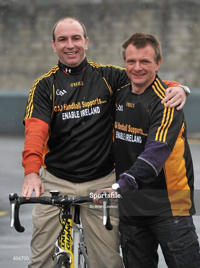 23 February 2010; The All-Ireland winning Kilkenny hurling squad, along with past players, and Ireland's top handballers, are preparing to don a jersey of a different nature on Saturday the 6th of March - taking to the roads of Kilkenny for a thirteen stage cycle around Kilkenny City to raise money for Enable Ireland. The Cats pedalling line up includes current stars such as Henry Shefflin and Tommy Walsh, as well as former giants of the game DJ Carey, Joe Hennessy and Noel Skehan. The event has been organised by Kilkenny handball legend Michael 'Ducksy' Walsh, who amassed and incredible 38 All-Ireland senior titles. Still playing at the top levels of the sport, Ducksy now dedicates much of his time to charity fundraising. The event is also being supported by the GAA and by the Irish Handball Council. At the announcement of the final route for the cycle are Kilkenny hurling great DJ Carey, left, and Kilkenny handball legend Michael 'Ducksy' Walsh, right. Enable Ireland, O'Neill Centre, St. Joseph's Road, Kilkenny. Picture credit: Brian Lawless / SPORTSFILE