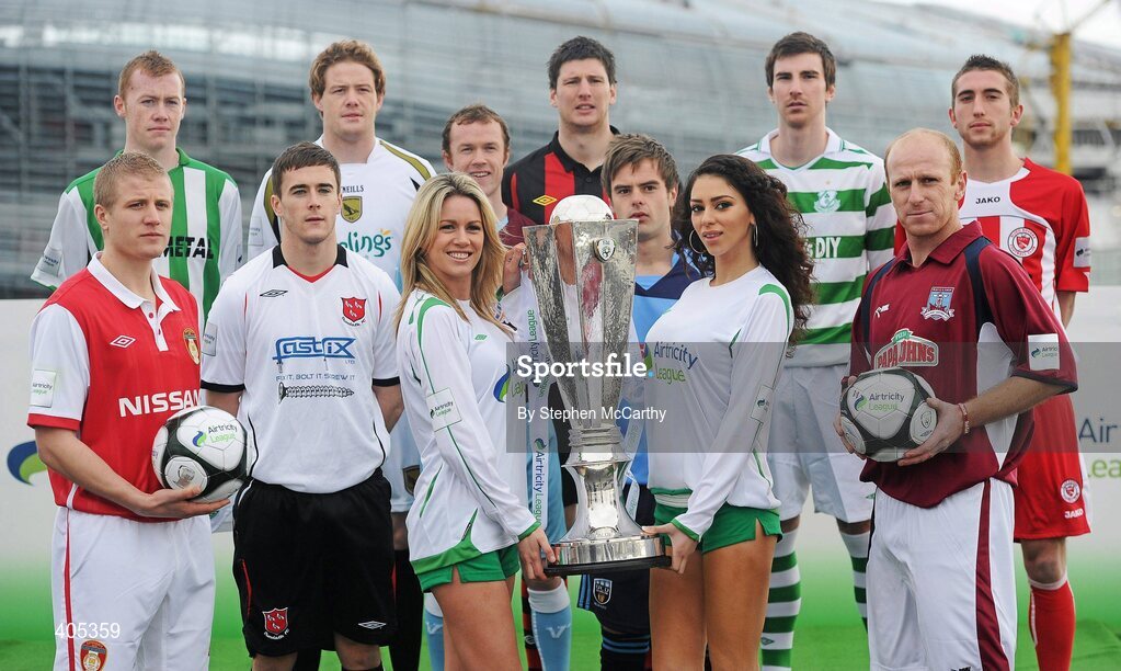 26 February 2010; Airtricity Premier Division players, from left, Conor Sinnott, St. Patrick's Athletic, Chris Shiels, Bray Wanderers, Steven Maher, Dundalk, Steven Paisley, Sporting Fingal, Brendan McGill, Drogheda United, Ken Oman, Bohemians, Greg Bolger, UCD, Craig Sives, Shamrock Rovers, Toma Heary, Galway United, and Iorlaigh Davoren, Sligo Rovers, with models Jenny Lee Masterson, left, and Georgia Salpa at the launch of 2010 Airtricity League. D4 Berkely Hotel, Ballsbridge, Dublin. Picture credit: Stephen McCarthy / SPORTSFILE