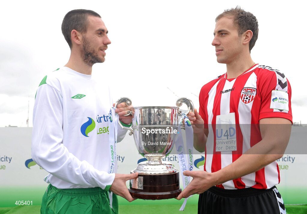26 February 2010; Mark McNulty, Cork City FORAS Co-op, and Mark McCrystal, Derry City, at the launch of 2010 Airtricity League. D4 Berkely Hotel, Ballsbridge, Dublin. Picture credit: David Maher / SPORTSFILE