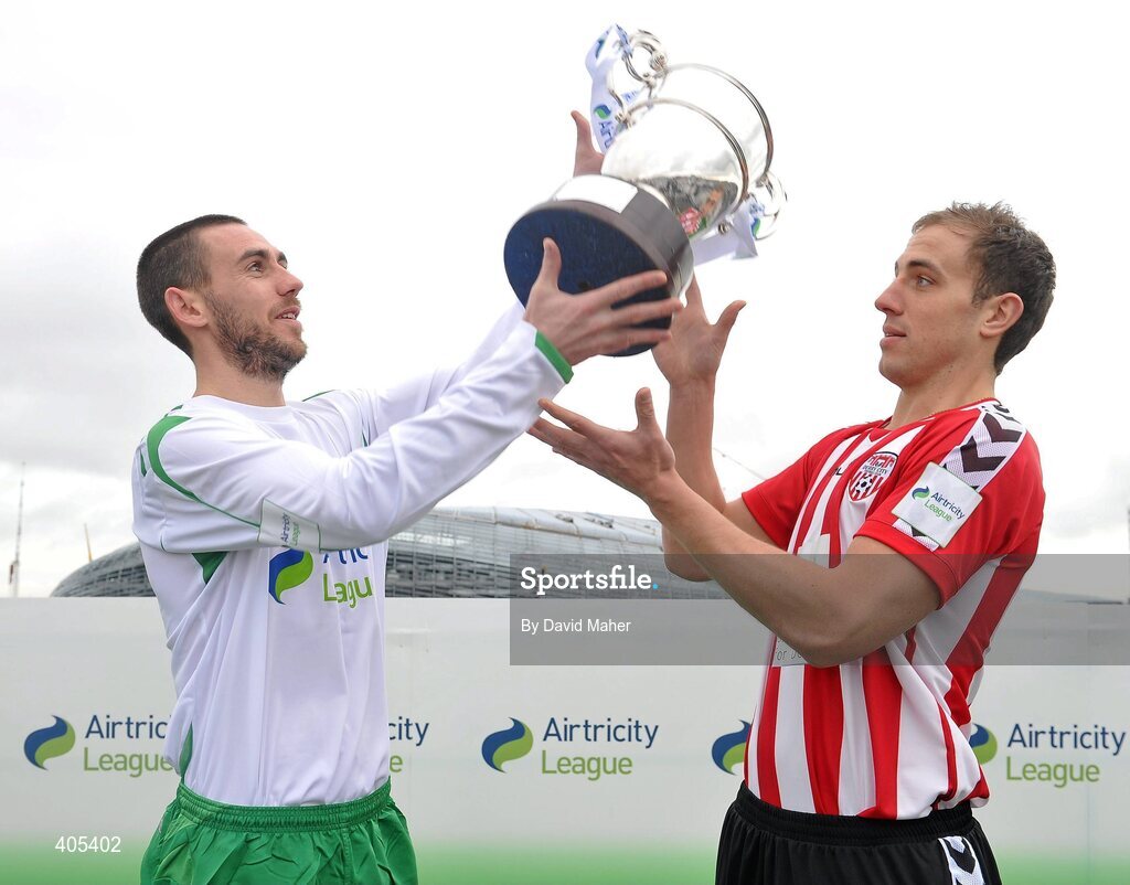 26 February 2010; Mark McNulty, Cork City FORAS Co-op, and Mark McCrystal, Derry City, at the launch of 2010 Airtricity League. D4 Berkely Hotel, Ballsbridge, Dublin. Picture credit: David Maher / SPORTSFILE