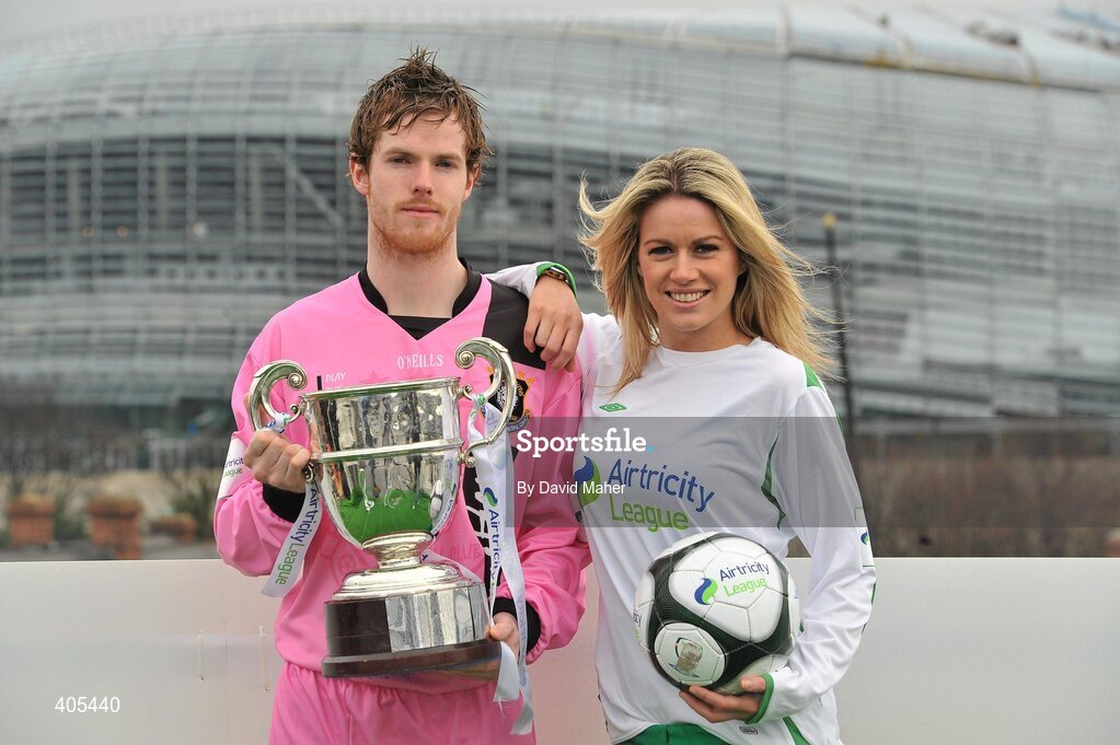26 February 2010; Gary Sheehan, Wexford Youths, with model Jenny Lee Masterson at the launch of 2010 Airtricity First Division. D4 Berkely Hotel, Ballsbridge, Dublin. Picture credit: David Maher / SPORTSFILE