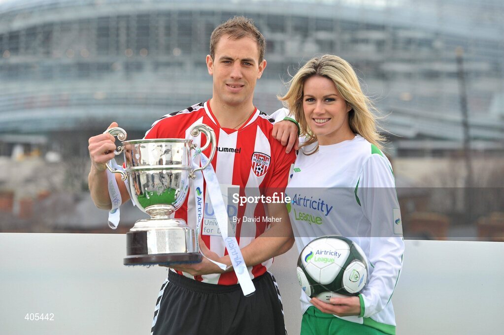 26 February 2010; Mark McCrystal, Derry City, with model Jenny Lee Masterson at the launch of 2010 Airtricity First Division. D4 Berkely Hotel, Ballsbridge, Dublin. Picture credit: David Maher / SPORTSFILE
