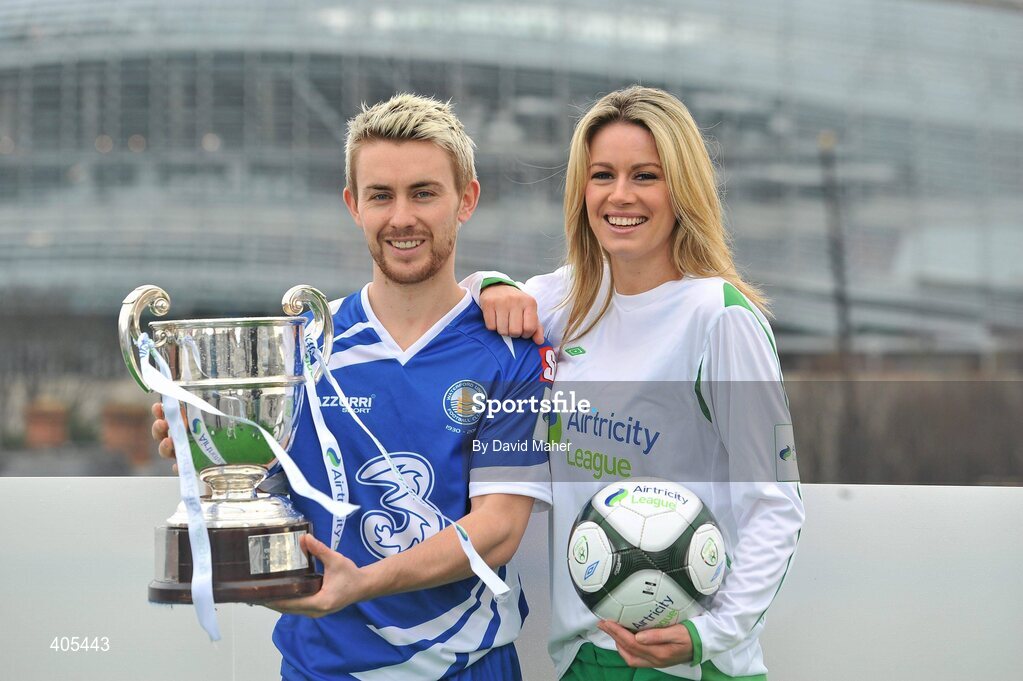 26 February 2010; Liam Kearney, Waterford United, with model Jenny Lee Masterson at the launch of 2010 Airtricity First Division. D4 Berkely Hotel, Ballsbridge, Dublin. Picture credit: David Maher / SPORTSFILE