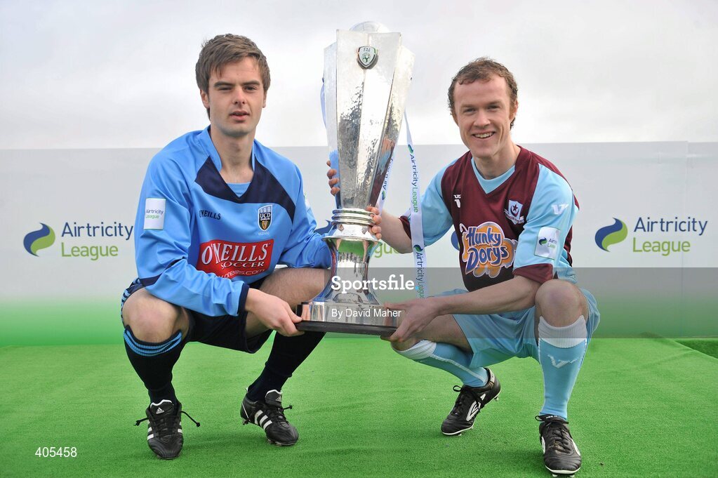 26 February 2010; Greg Bolger, UCD, and Brendan McGill, Shamrock Rovers, at the launch of 2010 Airtricity Premier Division. D4 Berkely Hotel, Ballsbridge, Dublin. Picture credit: David Maher / SPORTSFILE