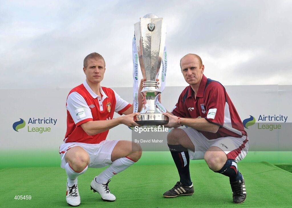 26 February 2010; Conor Sinnott, St. Patrick's Athletic, and Thomas Heary, Galway United, at the launch of 2010 Airtricity Premier Division. D4 Berkely Hotel, Ballsbridge, Dublin. Picture credit: David Maher / SPORTSFILE