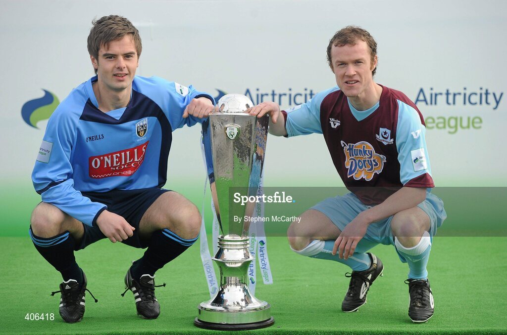 26 February 2010; Greg Bolger, UCD, and Brendan McGill, Galway United, at the launch of 2010 Airtricity League. D4 Berkely Hotel, Ballsbridge, Dublin. Picture credit: Stephen McCarthy / SPORTSFILE