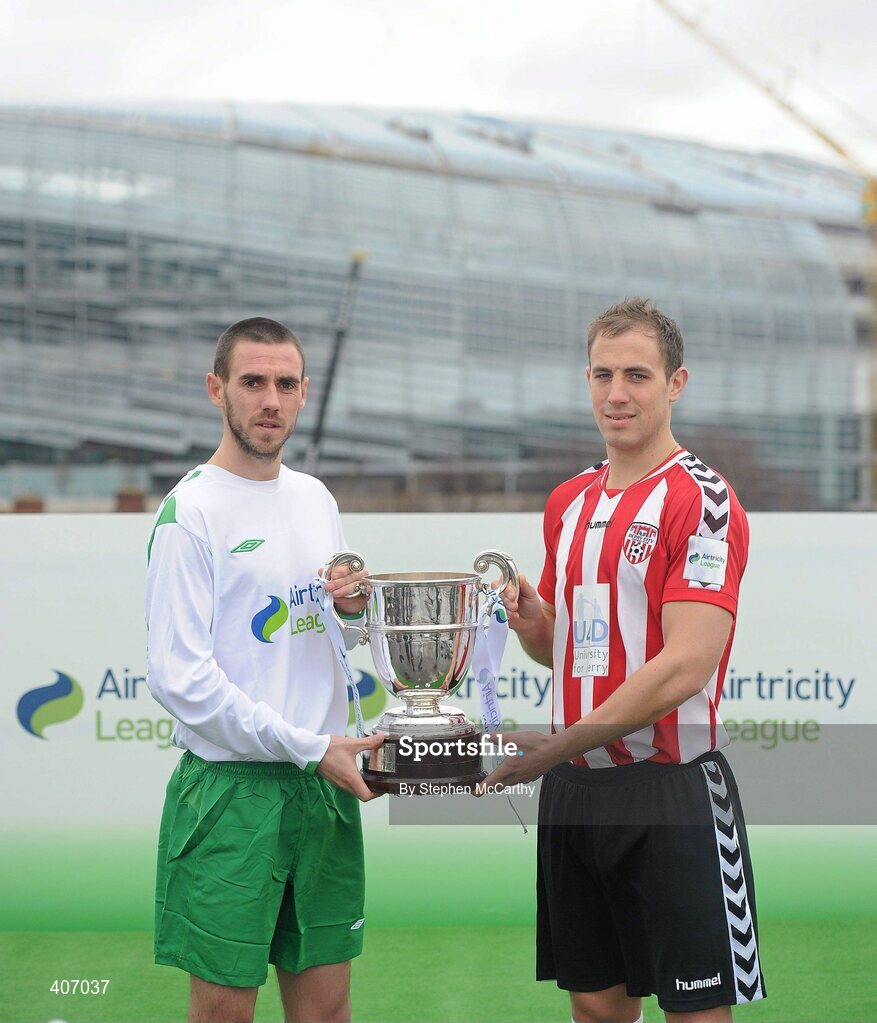 26 February 2010; Mark McNulty, Cork City FORAS Co-op, and Mark McCrystal, Derry City, at the launch of 2010 Airtricity League. D4 Berkely Hotel, Ballsbridge, Dublin. Picture credit: Stephen McCarthy / SPORTSFILE