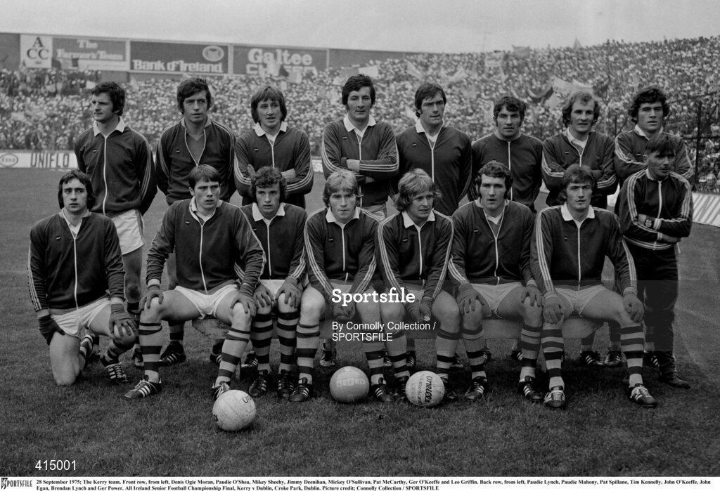 28 September 1975; The Kerry team. Front row, from left, Denis Ogie Moran, Paudie O'Shea, Mikey Sheehy, Jimmy Deenihan, Mickey O'Sullivan, Pat McCarthy, Ger O'Keeffe and Leo Griffin. Back row, from left, Paudie Lynch, Paudie Mahony, Pat Spillane, Tim Kennelly, John O'Keeffe, John Egan, Brendan Lynch and Ger Power. All Ireland Senior Football Championship Final, Kerry v Dublin, Croke Park, Dublin. Picture credit; Connolly Collection / SPORTSFILE