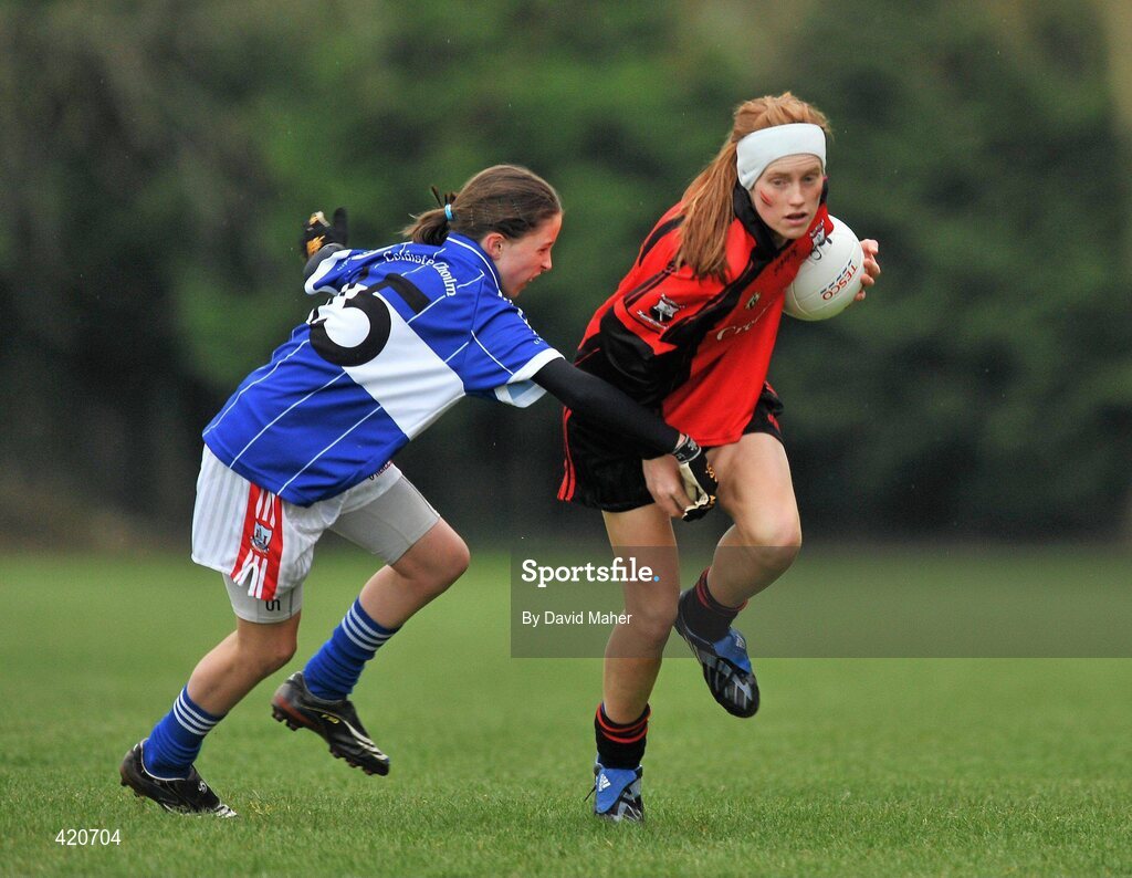 24 April 2010; Laura Dempsey, Scoil Mhuire, in action against Eimear Scally, Colaiste Choilim. Tesco All-Ireland Junior C Post Primary Schools Final, Colaiste Choilim, Ballincollig, Cork v Scoil Mhuire, Trim, Meath, St Rynaghs GAA, Banagher, Co Offaly. Picture credit: David Maher / SPORTSFILE