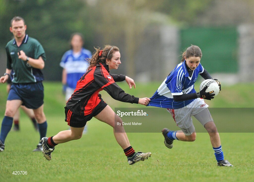 24 April 2010; Eimear Scally, Colaiste Choilim, in action against Shannon Cockram, Scoil Mhuire. Tesco All-Ireland Junior C Post Primary Schools Final, Colaiste Choilim, Ballincollig, Cork v Scoil Mhuire, Trim, Meath, St Rynaghs GAA, Banagher, Co Offaly. Picture credit: David Maher / SPORTSFILE