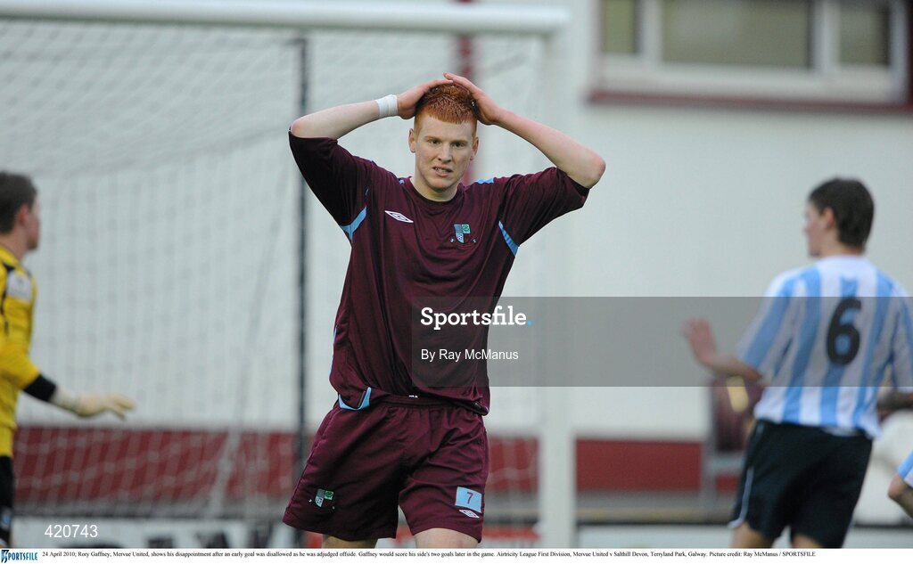 24 April 2010; Rory Gaffney, Mervue United, shows his disappointment after an early goal was disallowed as he was adjudged offside. Gaffney would score his side's two goals later in the game. Airtricity League First Division, Mervue United v Salthill Devon, Terryland Park, Galway. Picture credit: Ray McManus / SPORTSFILE