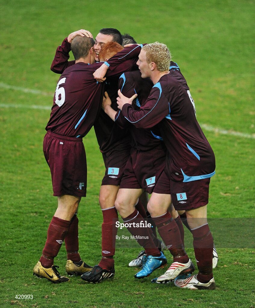 24 April 2010; Rory Gaffney celebrates, scoring his second goal for Mervue United, with team-mates Mike Tierney, left, Mark Ludden, 3, and Evan Connolly. Airtricity League First Division, Mervue United v Salthill Devon, Terryland Park, Galway. Picture credit: Ray McManus / SPORTSFILE