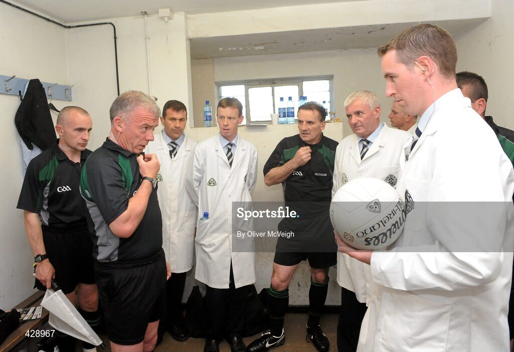 23 May 2010; Referee Pat McEnaney, doing a sound check with the rest of the officall's in the changing room before entering the pitch. Ulster GAA Football Senior Championship Quarter-Final, Antrim v Tyrone, Casement Park, Belfast, Co. Antrim. Picture credit: Oliver McVeigh / SPORTSFILE