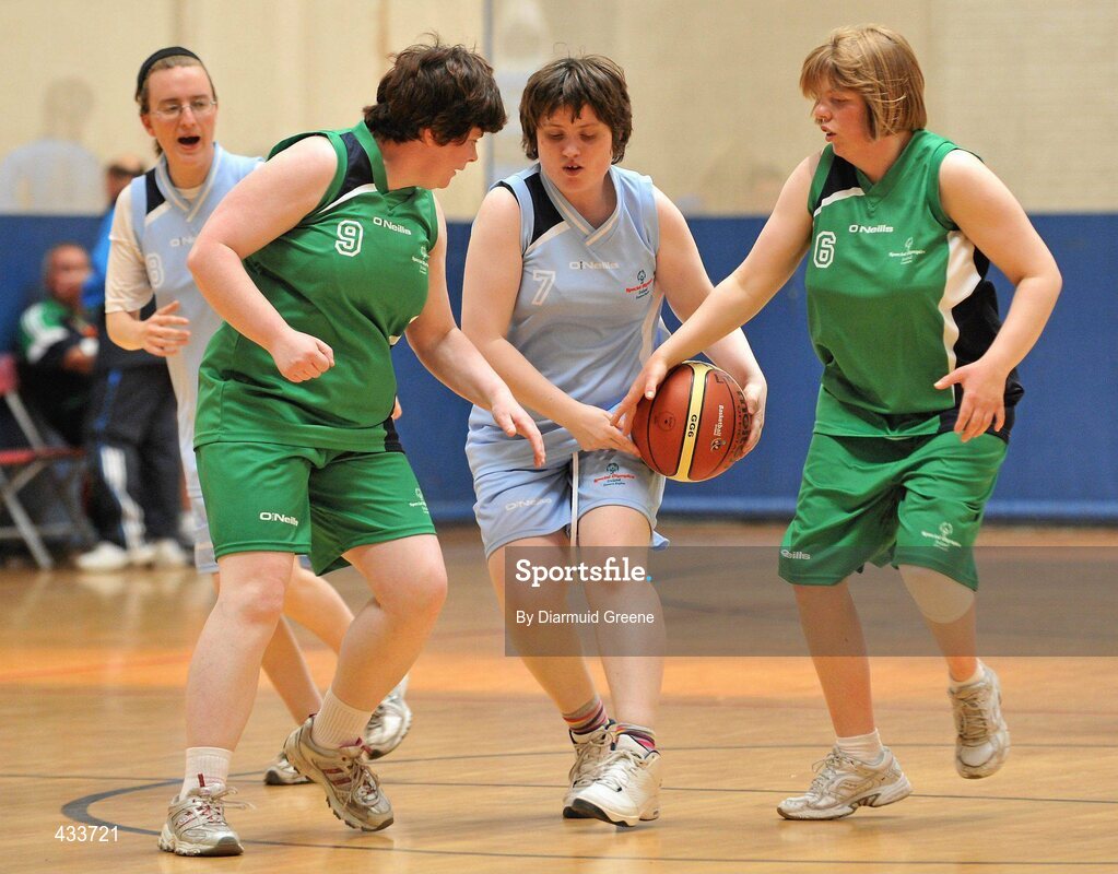 11 June 2010; Jane Murphy, from Navan Road, Dublin, Eastern Region, in action against Ann Coen, from Galway, left, and Linda Cully, from Mullingar, Co. Westmeath, Connaught, during the Womens Basketball during the second day of the 2010 Special Olympics Ireland Games. University of Limerick, Limerick. Picture credit: Diarmuid Greene / SPORTSFILE