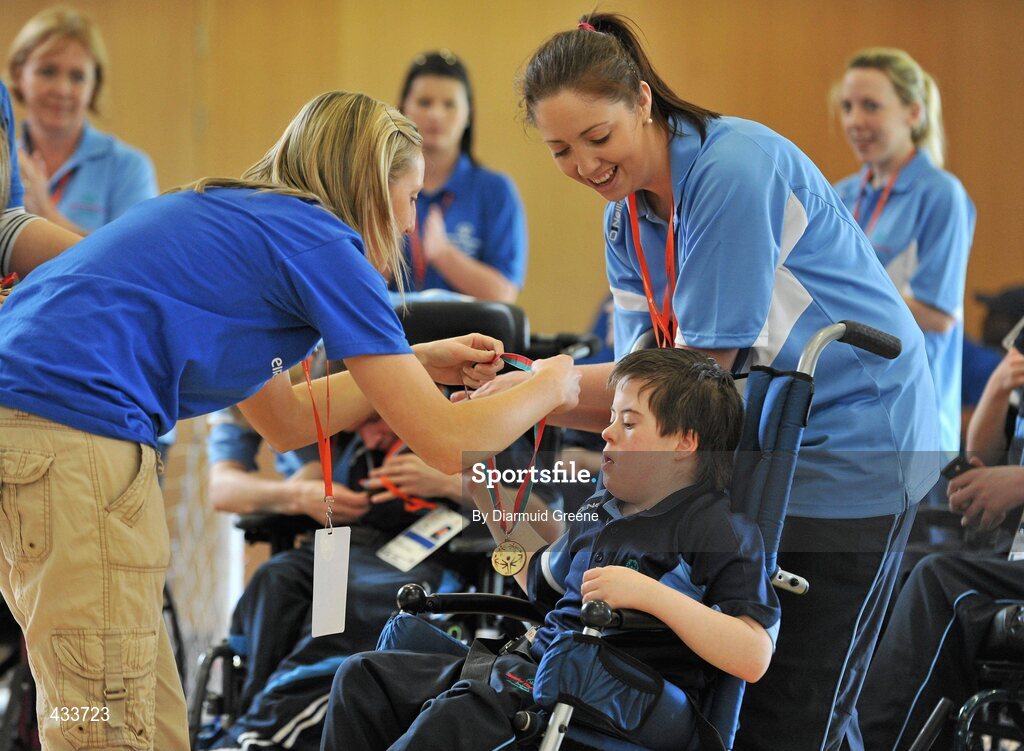 11 June 2010; Conor O'Driscoll, from Templeogue, Dublin, receives his medal after participating in the Motor Activity Training Programme. 2010 Special Olympics Ireland Games. Tailteann Centre, Mary Immaculate College, Limerick. Picture credit: Diarmuid Greene / SPORTSFILE