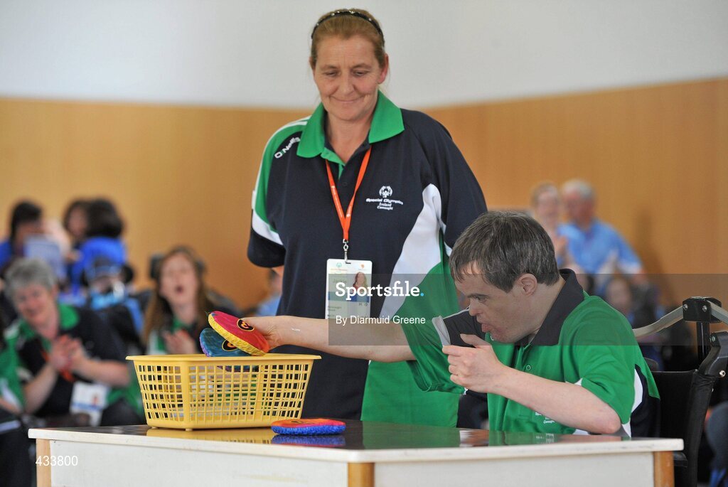 11 June 2010; Pauric Heslin, from Sligo, Connaught, along with coach Jackie Lynch, in action during the 2010 Special Olympics Ireland Games. Tailteann Centre, Mary Immaculate College, Limerick. Picture credit: Diarmuid Greene / SPORTSFILE