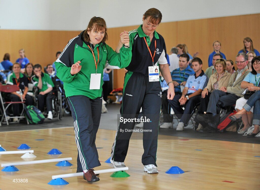 11 June 2010; Grainne Fitzgerald, from Cloonamahon, Co. Sligo, with her coach Susan Duncan, in action during Motor Activity Training Programme at the 2010 Special Olympics Ireland Games. Tailteann Centre, Mary Immaculate College, Limerick. Picture credit: Diarmuid Greene / SPORTSFILE