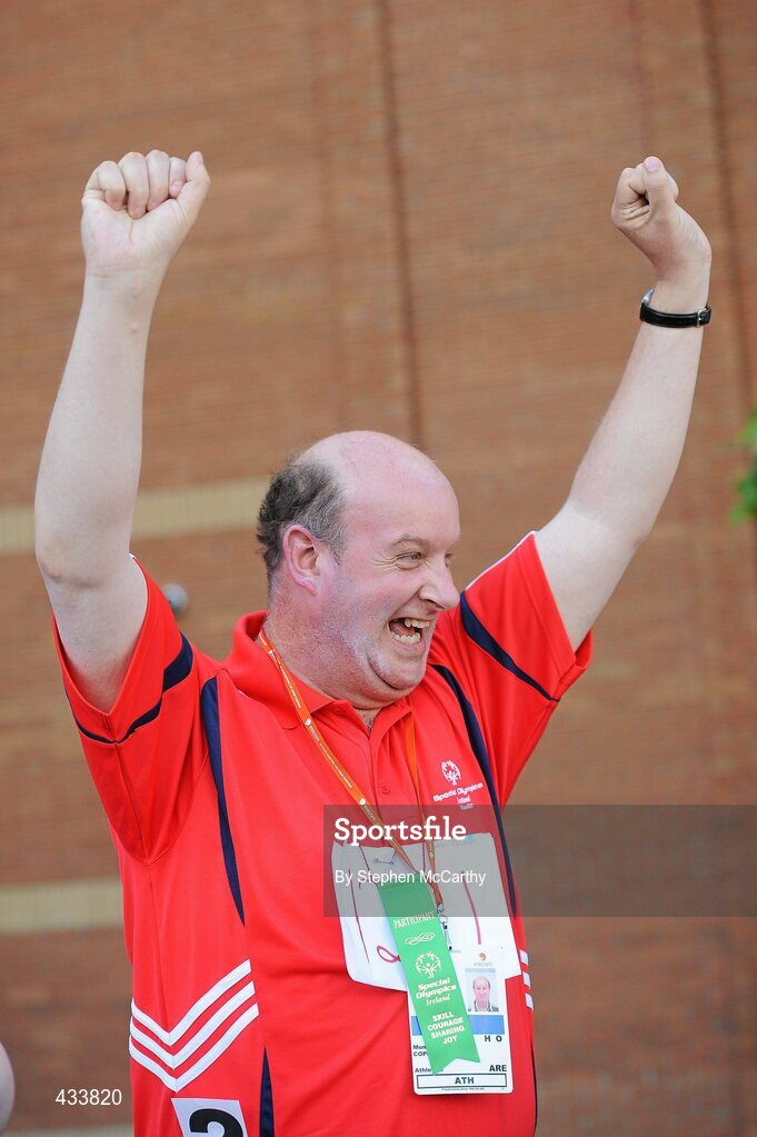 11 June 2010; John Dunlea, from Cork, celebrates his award for courage following the 100m athletics event during the second day of the 2010 Special Olympics Ireland Games. University of Limerick, Limerick. Picture credit: Stephen McCarthy / SPORTSFILE