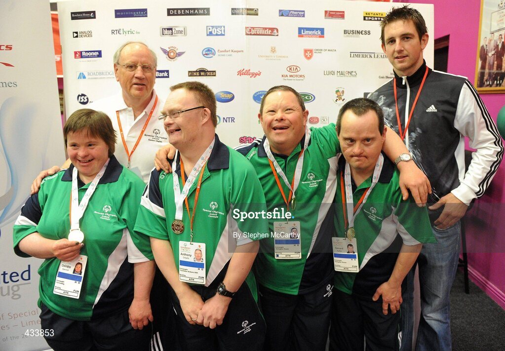 11 June 2010; Maurice Redmond, Chairman Special Olympics Eastern Region, left, and Tipperary hurler Conor O'Mahony with Connaught Team 6 athletes, from left, Deirdre Gannon, Anthony Grealis, Hugh Mohan and Gerard Rafter after receiving their gold medals for Division 5 Team Bowling event during the second day of the 2010 Special Olympics Ireland Games. Funworld, Ennis Road, Limerick. Picture credit: Stephen McCarthy / SPORTSFILE