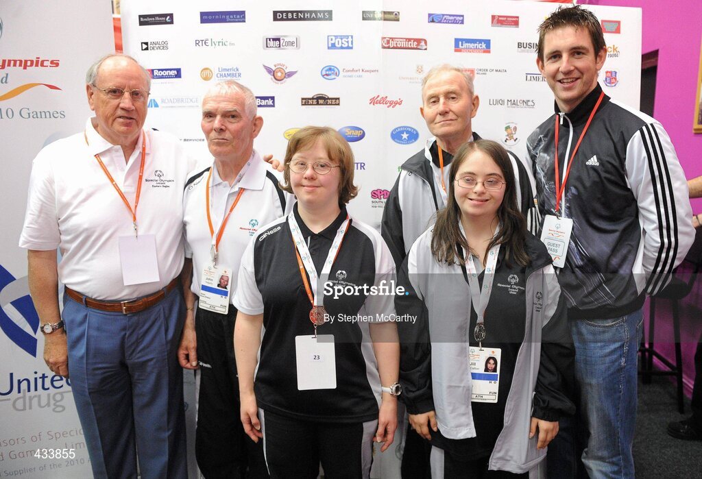 11 June 2010; Maurice Redmond, Chairman Special Olympics Eastern Region and Tipperary hurler Conor O'Mahony with Ulster Team 7, from left, John Hegarty, Ballybofey, Donegal, Gemma Collins, Newry, Down, Jackie Gilmour, Foyle, Derry, and Jill McCallion, Foyle, Derry, after receiving their medals for 2nd place in the Division 5 Team Bowling event during the second day of the 2010 Special Olympics Ireland Games. Funworld, Ennis Road, Limerick. Picture credit: Stephen McCarthy / SPORTSFILE