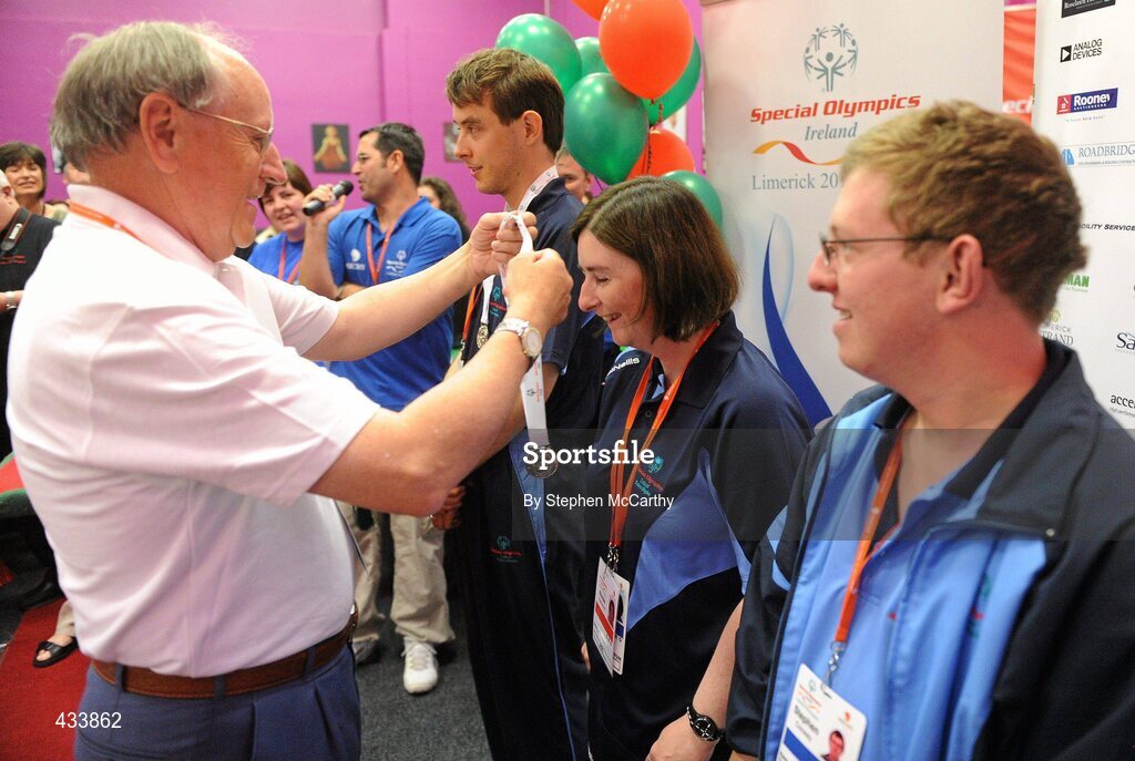 11 June 2010; Maurice Redmond, Chairman Special Olympics Eastern Region, presents his daughter Nicole, Eastern Team 15, with her second place medal in the Team Bowling event during the second day of the 2010 Special Olympics Ireland Games. Funworld, Ennis Road, Limerick. Picture credit: Stephen McCarthy / SPORTSFILE