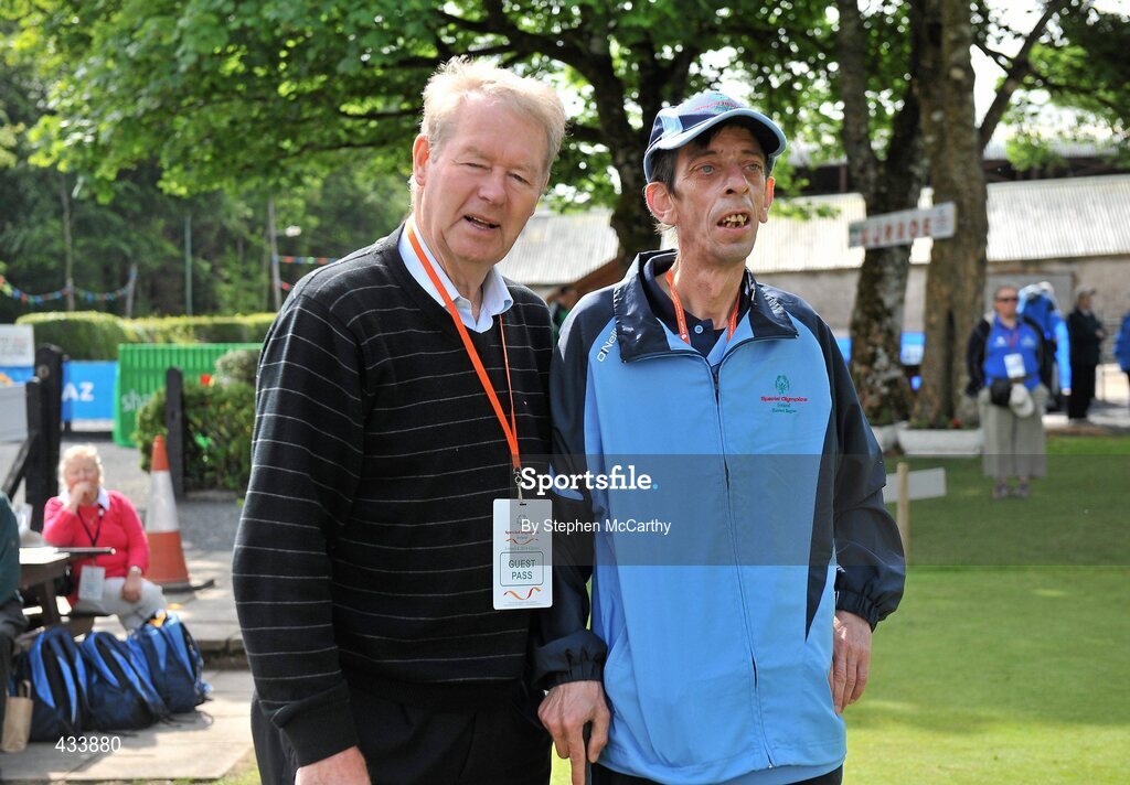 11 June 2010; Athlete Gerry Clail, from Portrane, Dublin, with Micheal O Muircheartaigh during the Pitch & Putt event during the second day of the 2010 Special Olympics Ireland Games. Murroe, Limerick. Picture credit: Stephen McCarthy / SPORTSFILE