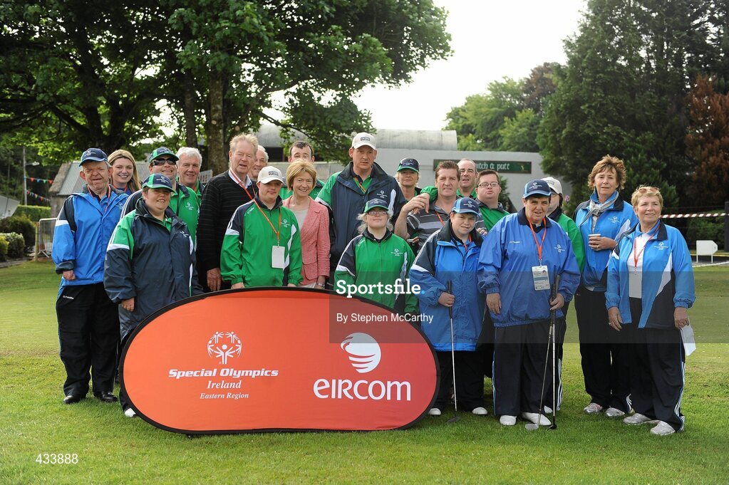 11 June 2010; Micheal O Muircheartaigh, Mary Davis, Managing Director of Special Olympics Europe / Eurasia, and Matt English, CEO of Special Olympics Ireland, with athletes and assisants during the Pitch & Putt event during the second day of the 2010 Special Olympics Ireland Games. Murroe, Limerick. Picture credit: Stephen McCarthy / SPORTSFILE